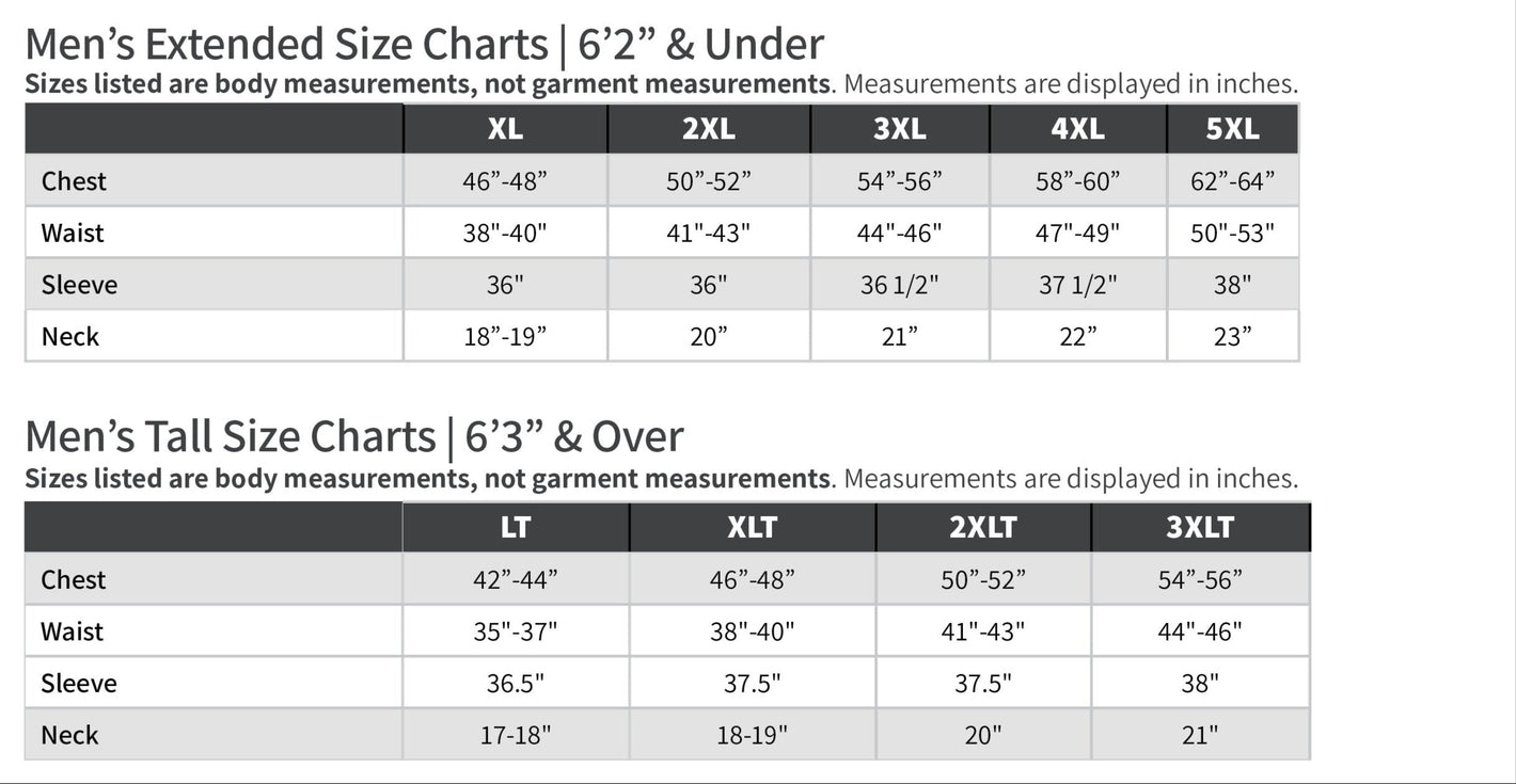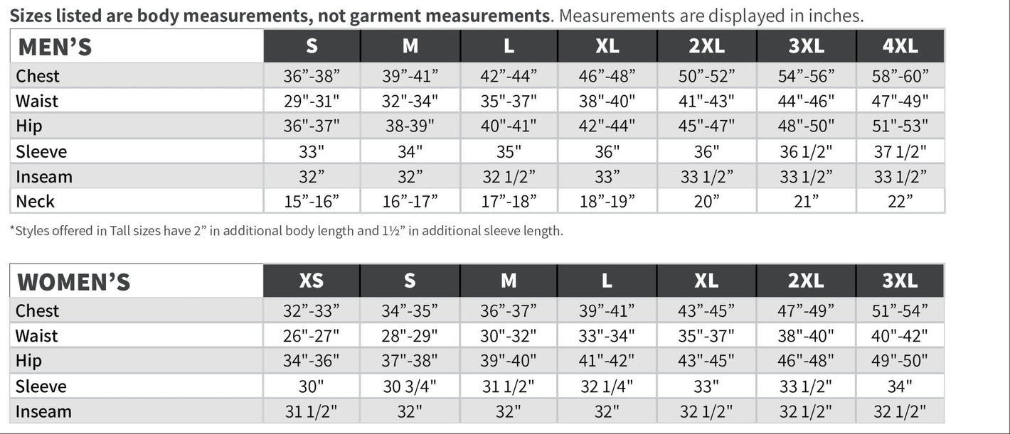 The general garment size range for women is XS-3XL and for men is S-4XL, with many men's styles offered in additional big and tall sizes. Styles offered in Tall sizes have 2" in additional body length and 1-1/2" in additional sleeve length.